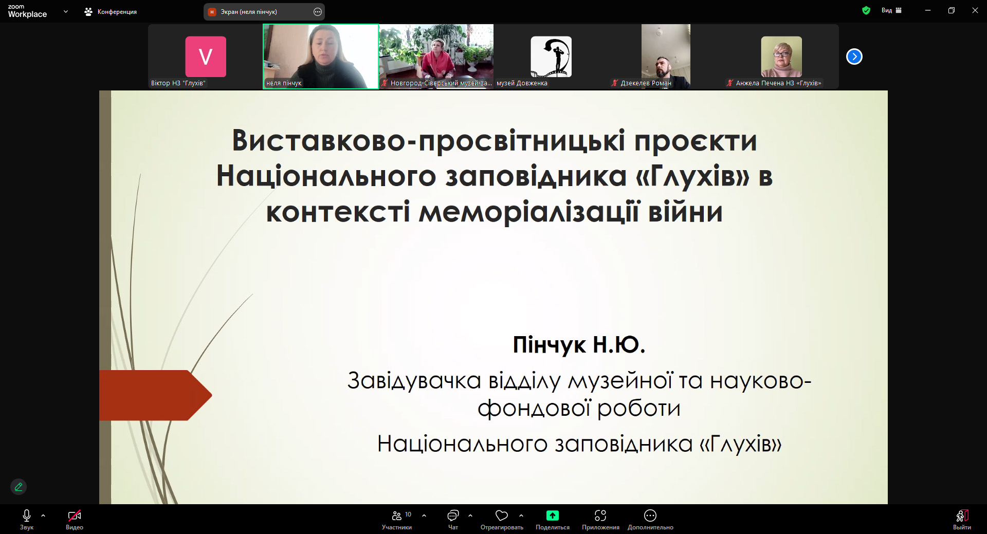Завідувачка відділу музейної та науково-фондової діяльності Національного заповідника «Глухів» Неля Юріївна Пінчук у доповіді «Виставково-просвітницькі проєкти Національного заповідника “Глухів” в контексті меморіалізації російсько-української війни» визначила роль музейного простору у формуванні національної свідомості та культурної-історичної пам’яті, розкрила значення постаті полеглого історика-воїна Юрія Коваленка і його внеску в меморіалізацію воєнних дій під час Другої світової та сучасної російсько-української війни. Науковий співробітник Заповідника Роман Євгенійович Дзекелев виступив з доповіддю «Синергія історичної освіти та культурної спадщини у вихованні національної ідентичності української молоді» (на прикладі діяльності ГО «Козацький клуб “Гарда”)», висвітливши свій практичний досвід у співпраці з майстром народної творчості, полеглим захисником України Ігорем Білевичем з навчання глухівських школярів звичаїв і традицій українського козацтва та опанування ними технік козацьких бойових мистецтв.